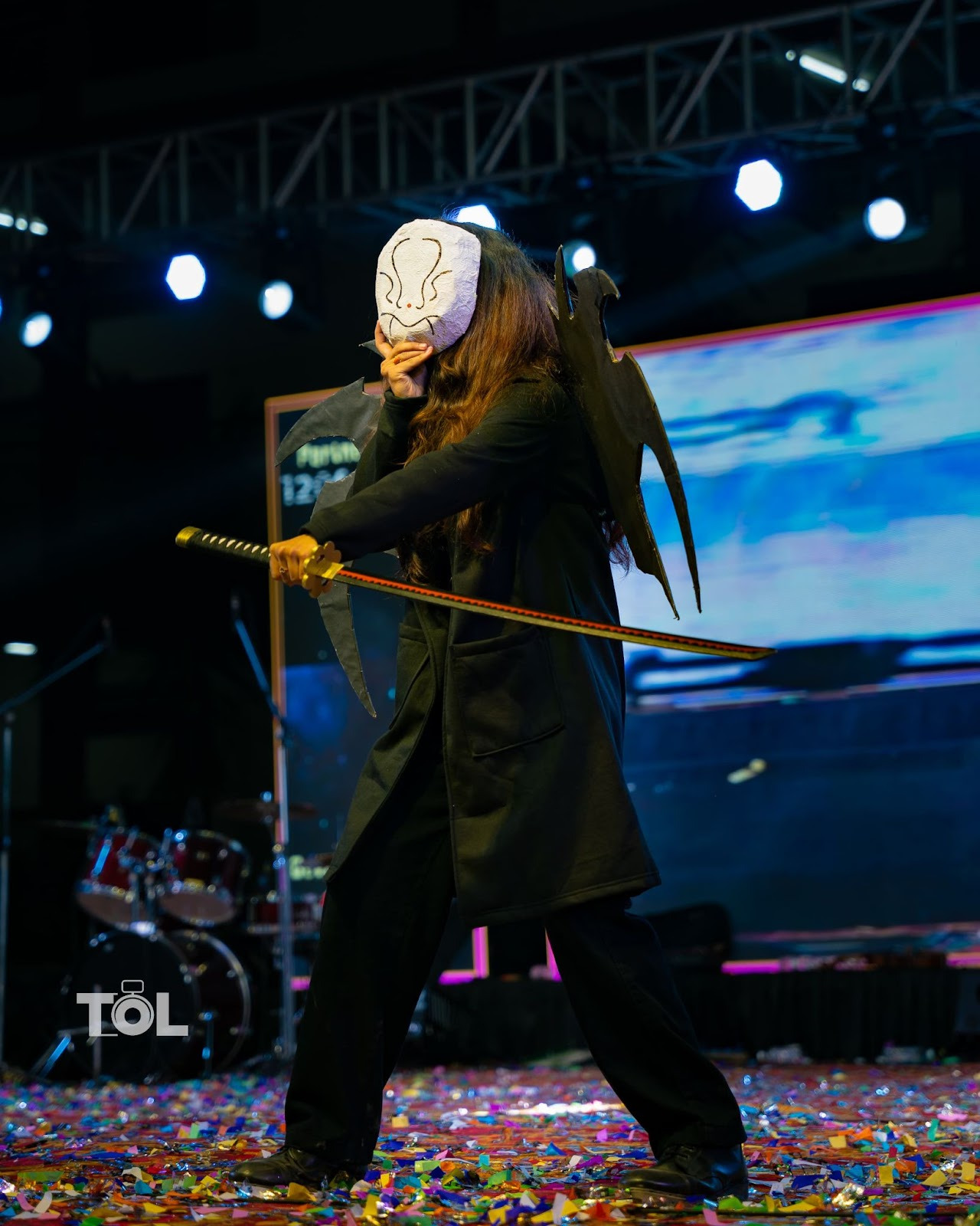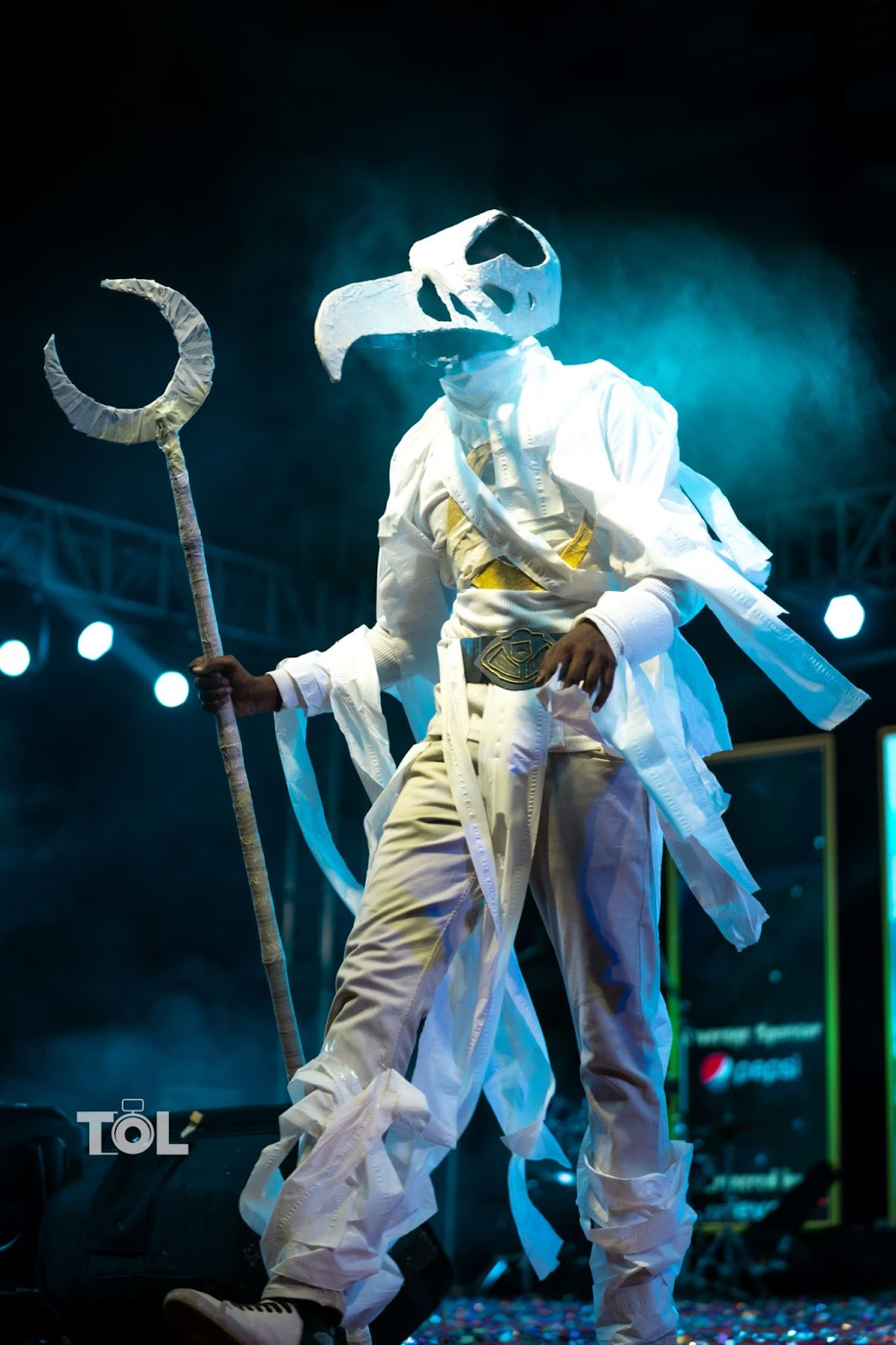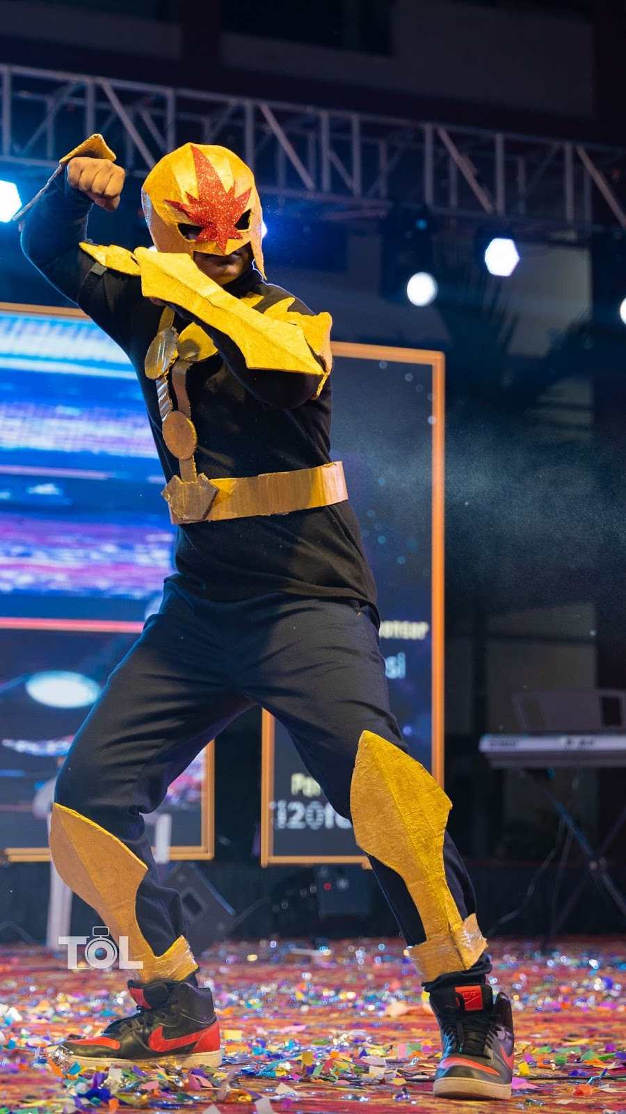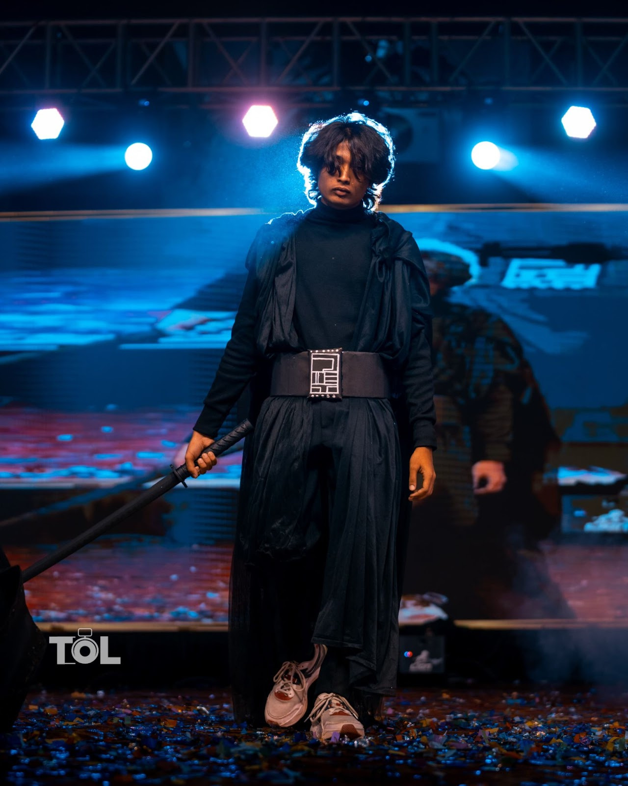 This standout look totally stole the spotlight at the evening’s show, with Virinchi rocking a Moon Knight cosplay as Marvel’s Khonshu. It was one of the trickiest costumes to put together, made entirely from upcycled materials. The staff came from an old stick, some cardboard, and a few ribbons for flair. The belt was cardboard too, with clay added for cool detailing. A cardboard moon, brushed with paint, sat prominently on the bodice. The toughest part was definitely the mask , Riti had a real challenge making sure it was the right size and fit Virinchi perfectly, using a net for the structure and paper mache for the finish. Topping it all off were rolls of toilet paper wrapped around to give you that mummy bandages look.This costume was a clear winner, turning heads all night.
