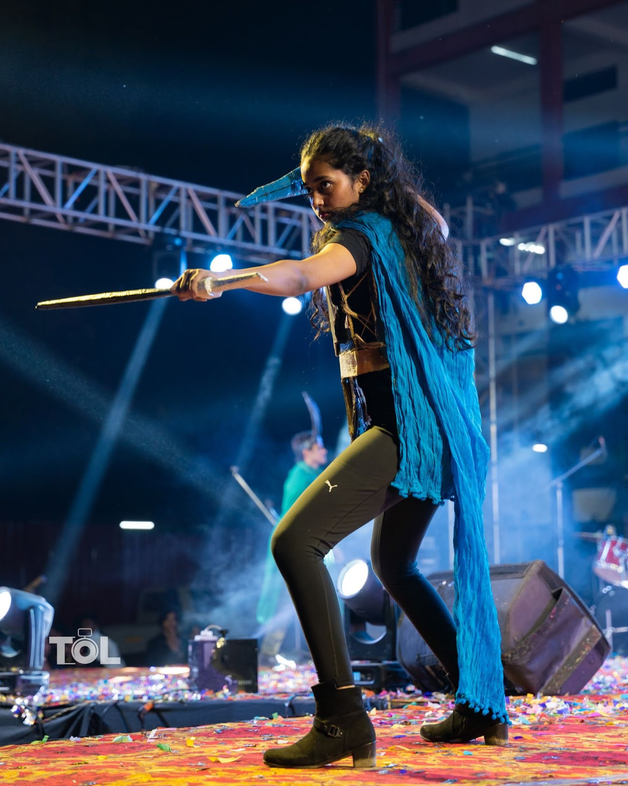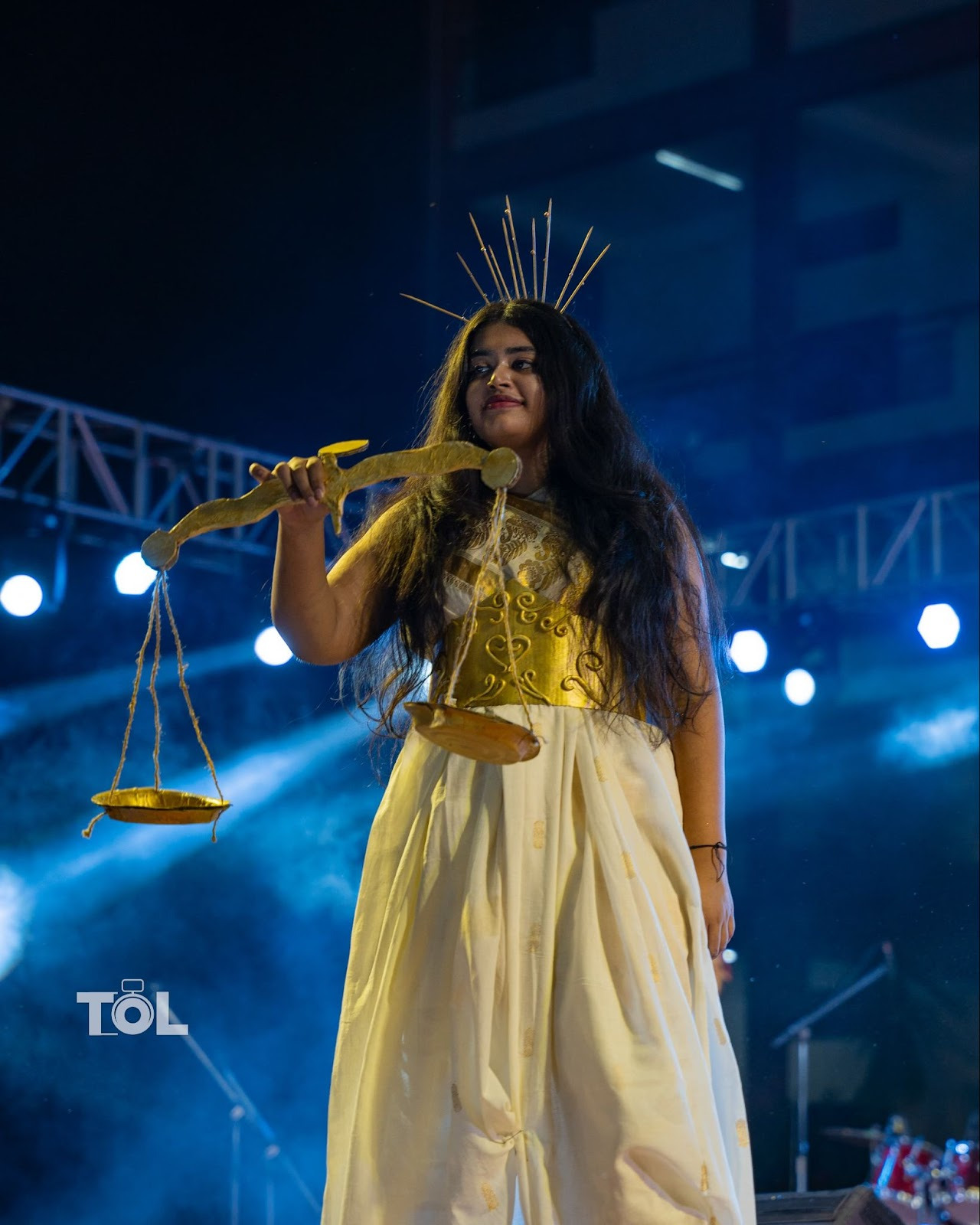 In this look Aditi was embodying Libra the constellation with stunning flair. The costume posed one of the toughest challenges, crafted from a saree that required meticulous draping to achieve its elegant flow. The standout belt, fashioned entirely from cardboard with intricate clay detailing, added a bold touch. The radiant halo was ingeniously made from an old headband adorned with a cluster of sticks, while the scales were crafted from paper plates, twine, and cardboard, painted to gleam under the lights.