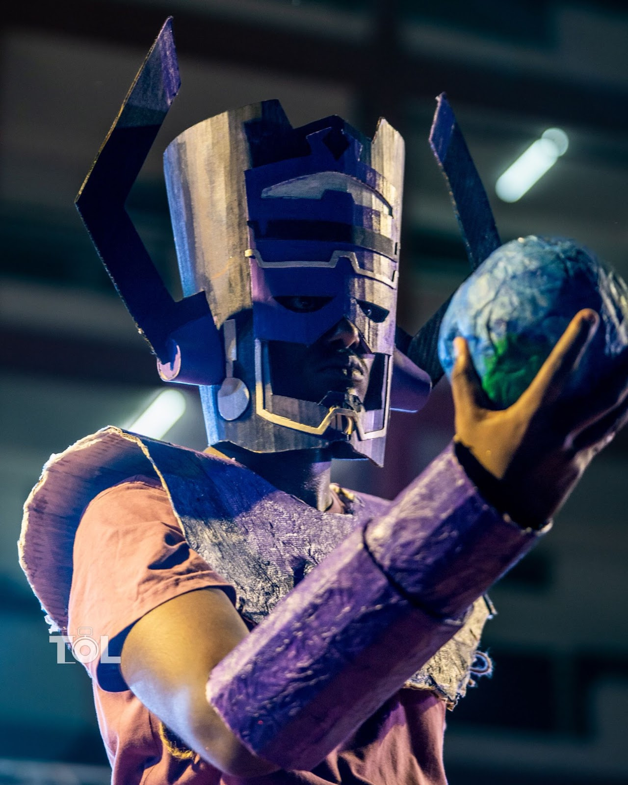 Marvel’s Galactus, holding a paper-crafted globe. The costume proved a creative challenge, built entirely from upcycled materials. The iconic helmet, with its towering horns, was meticulously shaped from cardboard and painted in bold blues and purples for a cosmic effect. The armor, also crafted from cardboard, featured layered textures and vibrant purple hues, giving a regal yet otherworldly vibe. The globe, a standout prop, was formed from paper and painted with earthy tones to represent a planet. The toughest task was ensuring the helmet’s fit, requiring precise adjustments as per the model.